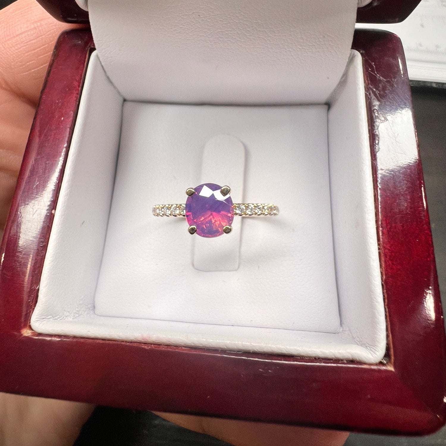Custom engagement ring set with a Unheated kashmir sapphire. Displaying mystical hues of purple and pink.